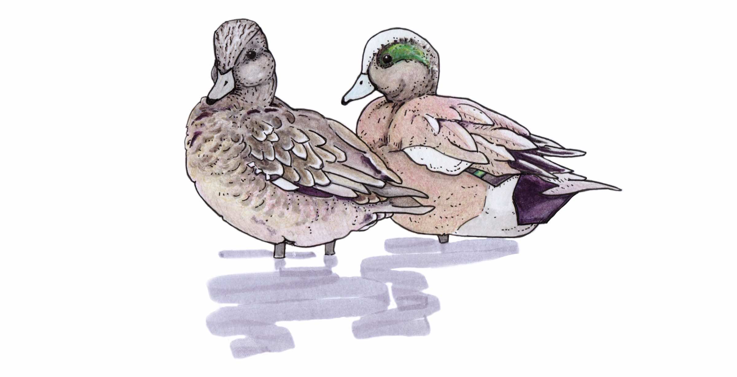 The American Wigeon is one of many ducks found in the Chugach Region but can be easily distinguished by its unique shape. Wigeons have a very round head, short neck, and small bill. The male (drake) American Wigeon has a wide, flashy green stripe around the eyes and a pale white or cream cap from the top of the bill to the back of the head. A common name used for the male wigeon is “baldplate,” referring to its seemingly bald head. The rest of the drake’s body is like the hen’s body. The hen has a warm brown, sometimes red or grayish, plumage with a black tail. Both sexes have a very pale, almost blue, bill with a black tip and gray legs.