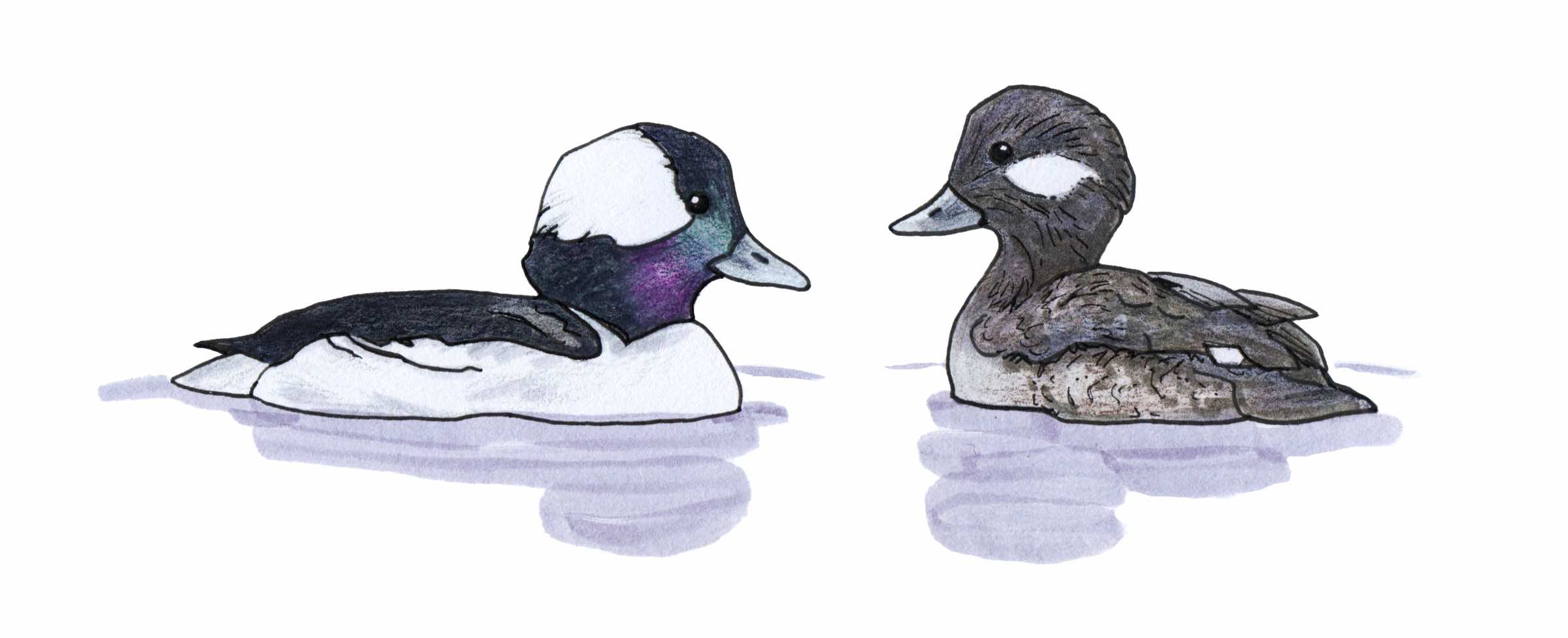Buffleheads are some of the smaller ducks in the Chugach Region. The males have a white body, black back, and black head that shines metallic colors with a large white patch that wraps the back of the head. The females are a gray brown all over with a distinct white patch on the cheek.